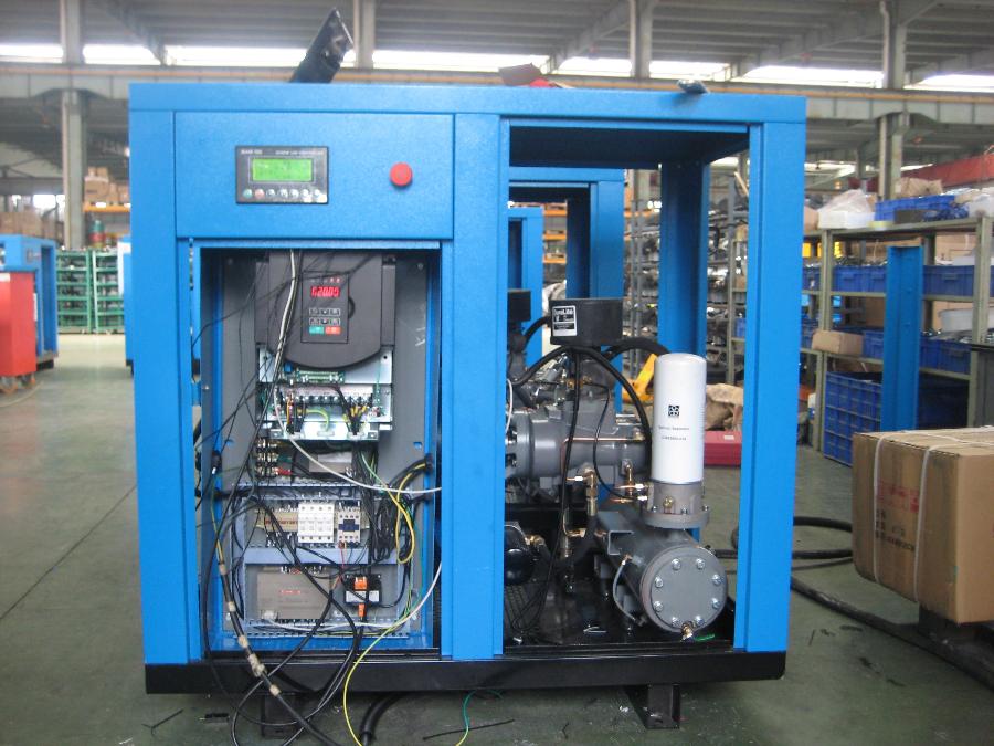 采用變頻器可通過(guò)改變螺桿轉(zhuǎn)子轉(zhuǎn)速的方式來(lái)改變排氣量,當(dāng)用氣量發(fā)生變化時(shí),變頻器改變轉(zhuǎn)速的方式調(diào)節(jié)空壓機(jī)的排氣量,達(dá)到排氣壓力恒定不變,并節(jié)約能源的目的。