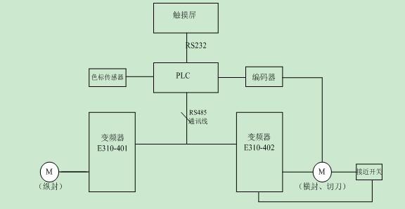 雙變頻立式包裝機(jī)由PLC+觸摸屏+2臺(tái)E310變頻器+編碼器+色標(biāo)傳感器及繼電器組成電控系統(tǒng);溫控電路由智能型溫控表、固態(tài)繼電器、熱電偶元件等組成,控溫精確,顯示直觀,設(shè)定方便;機(jī)械部分包括包裝薄膜、初級(jí)導(dǎo)向輥筒、橡膠輥筒、導(dǎo)向輥筒、薄膜導(dǎo)向器、灌裝填充物、縱向熱封口輥筒、橫向熱封口輥筒、橫向冷卻封口輥筒、切口裝置、分袋切割裝置、成品輸出裝置等。