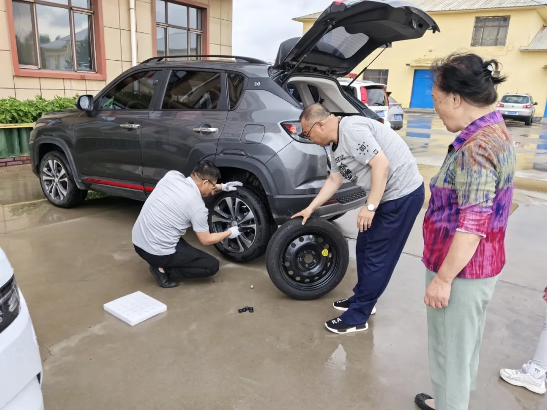 值班所長(zhǎng)陳勇和收費(fèi)所職工曹俊取來維修工具,先用千斤頂將車輛頂起,又熟練地拆卸螺絲、更換備胎,安裝完成后又對(duì)全車進(jìn)行仔細(xì)檢查,并提醒李女士雨天出行注意事項(xiàng)。收費(fèi)所工作人員還為李女士準(zhǔn)備了玻璃水和礦泉水,李女士緊緊握著工作人員的手連連道謝。